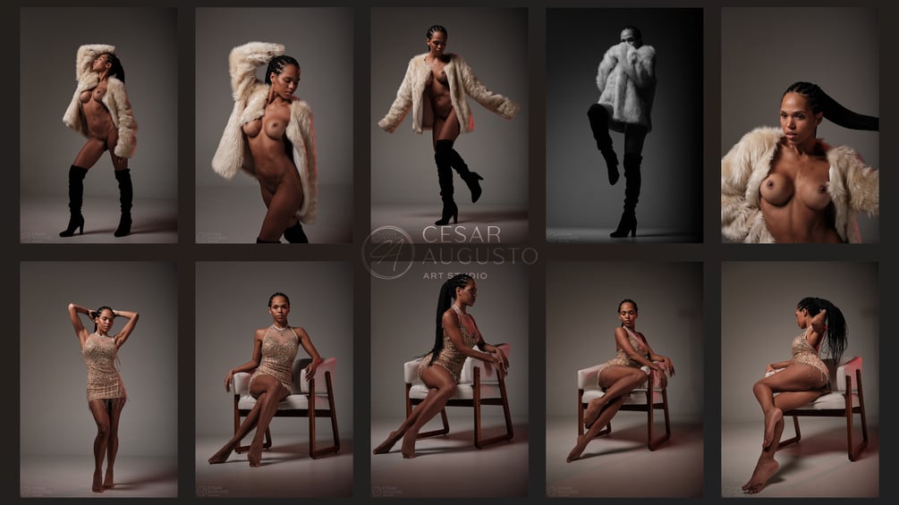 The lighting follows a Rembrandt setup with a deep, dramatic tone, enhanced by a red rim light that highlights her contours and silhouette. The mix of shadows and glow gives her skin a radiant depth, making each pose stand out with intensity and elegance.